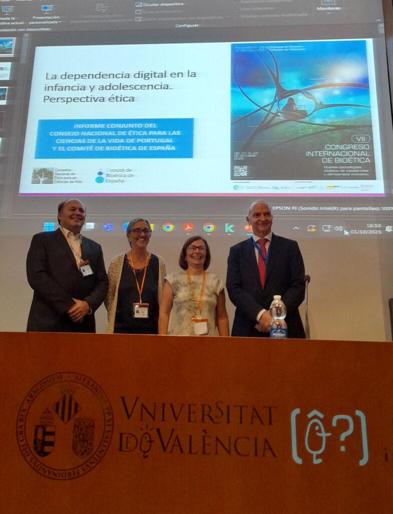 En el marco de este Congreso, el Comité de Bioética de España ha presentado los avances en el informe que está preparando con el Consejo Nacional de Ética para las Ciencias de la Vida de Portugal sobre adicción a pantallas, acto en el que ha contado con la presencia del vicepresidente del Comité de Portugal, André Días y con el presidente y la vicepresidenta del Comité de España, Juan Carlos Siurana e Isolina Riaño.
